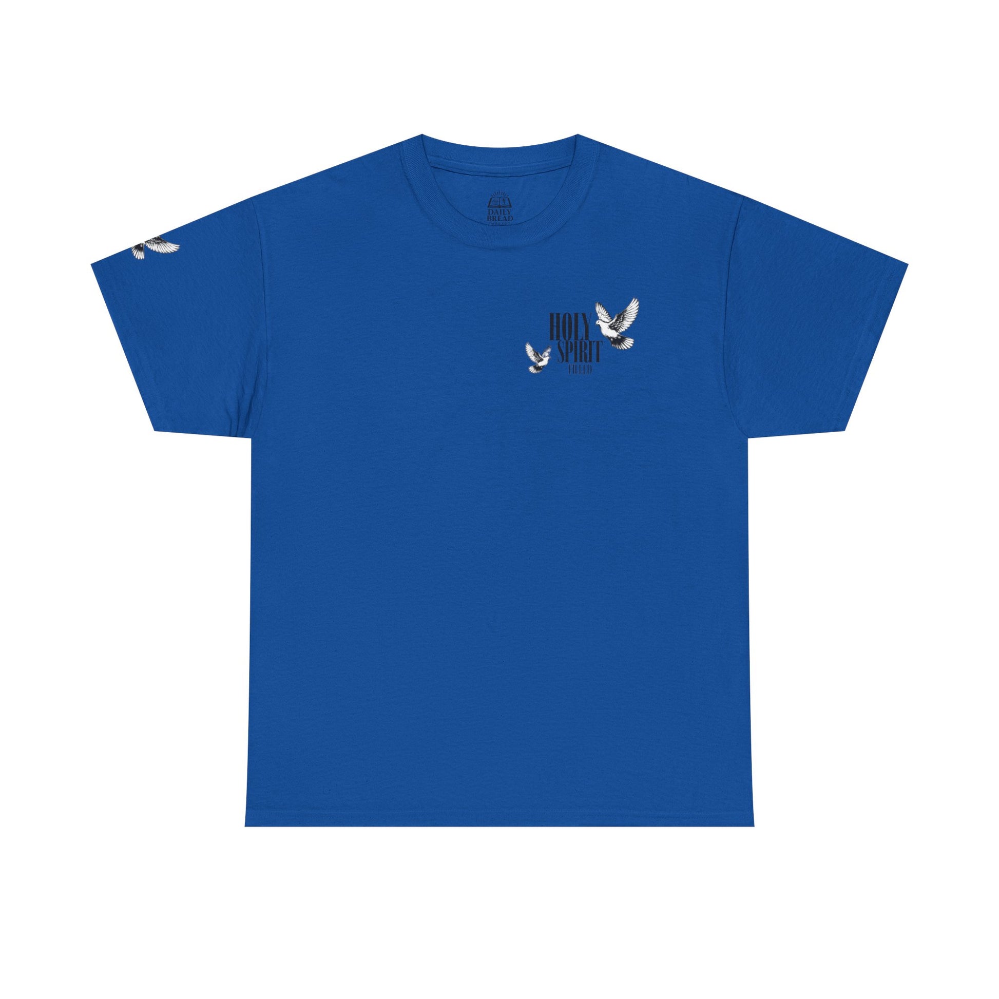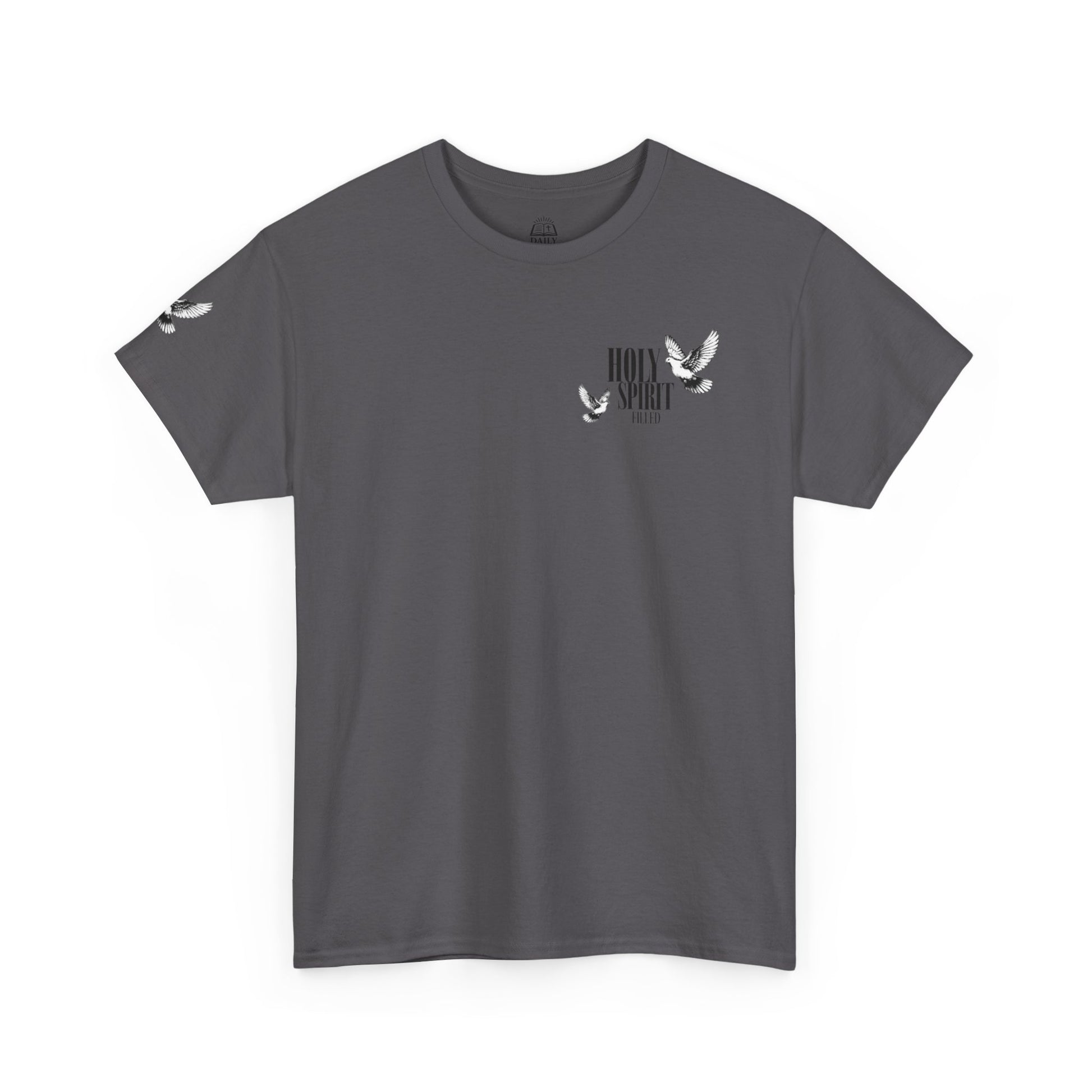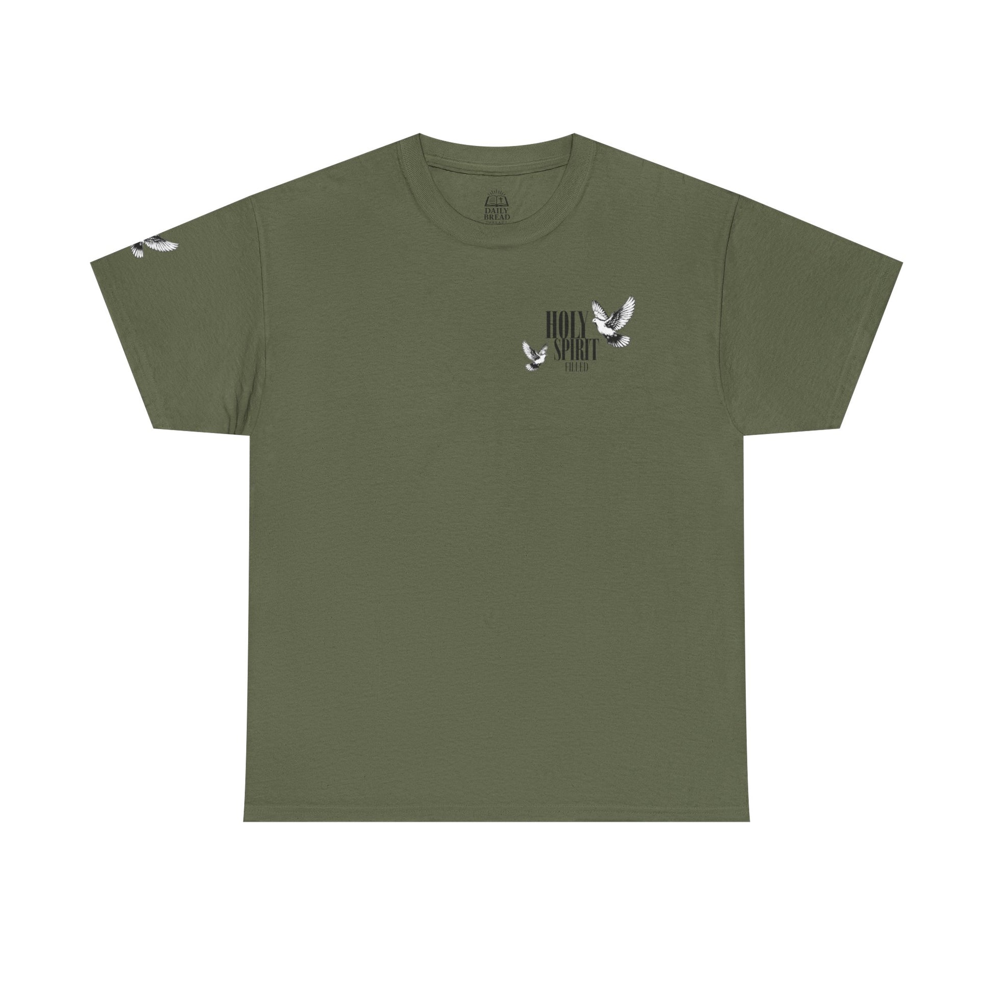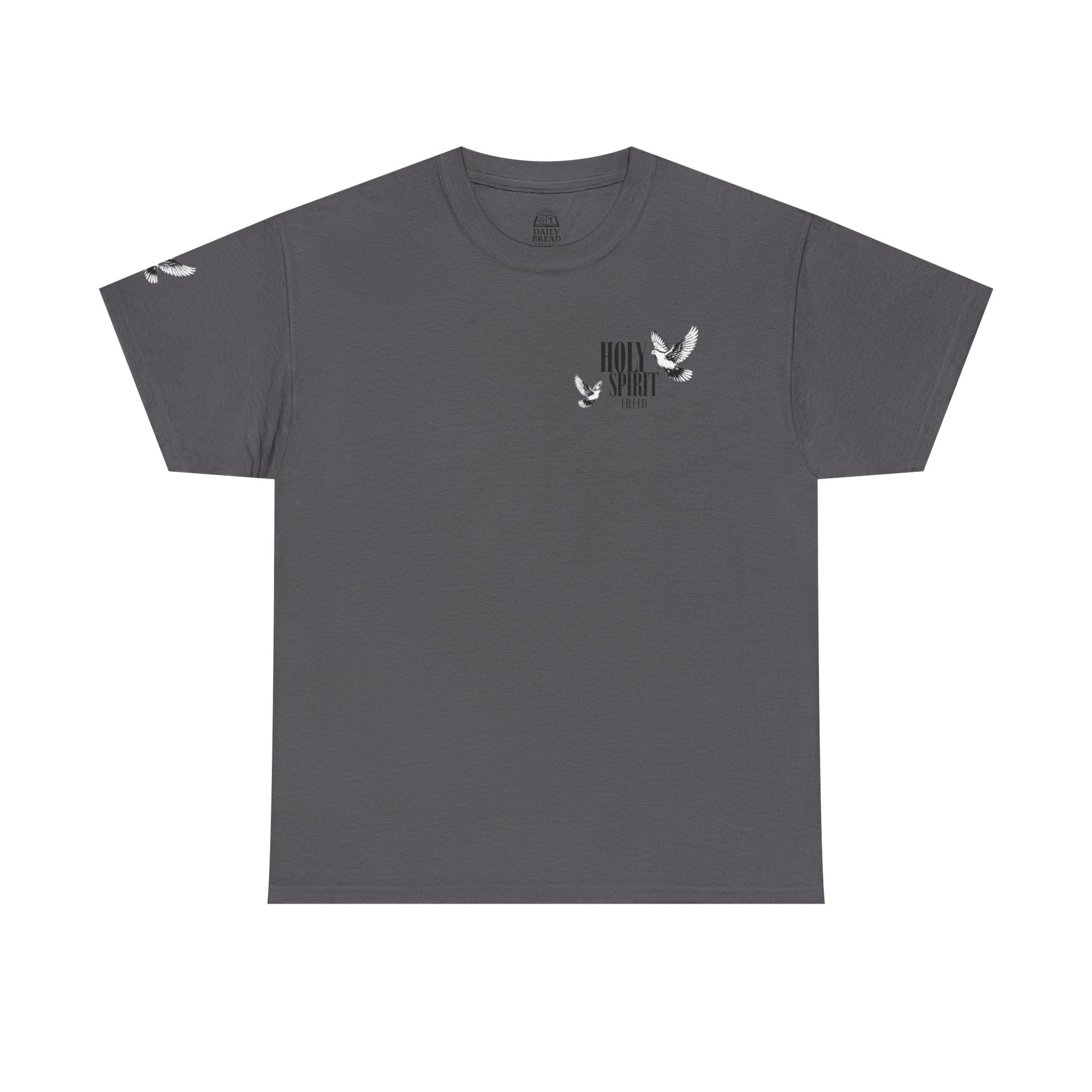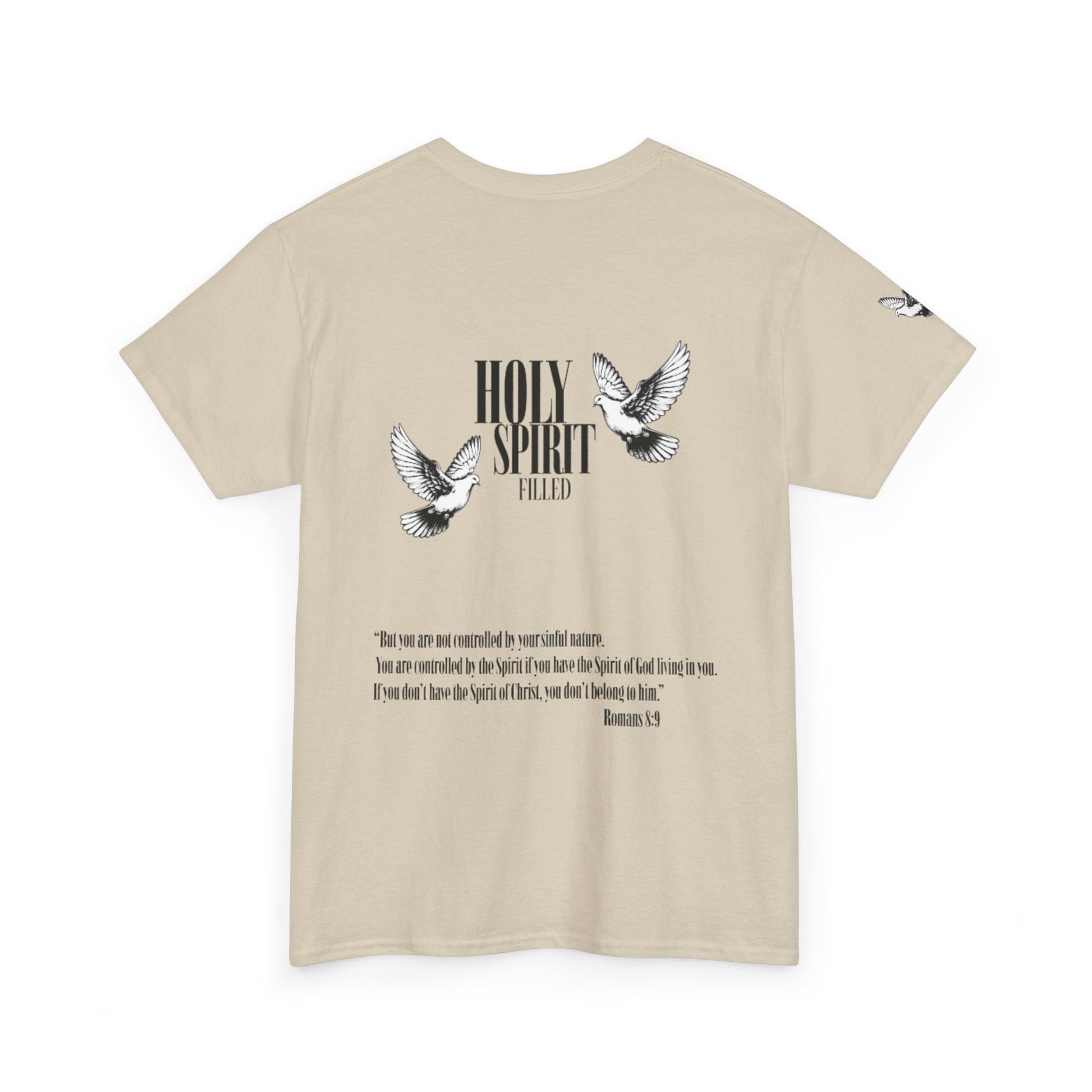 This tee carries a quiet, fierce conviction. The Holy Spirit Filled Tee is a soft, sturdy shirt that speaks identity and purpose — a wearable reminder that your strength and authority come from the Spirit, not the world. Short, declarative text and Romans 8:9-inspired message sit clearly against the fabric, inviting daily courage and gentle witness. It slips into weekdays, worship mornings, and community outreach with ease: layer it under a cardigan for study groups, toss it on for volunteer days, or wear it after coffee with friends who share your faith. The tone is bold without shouting — confident, grounded, and tender. It’s for the person who wants their faith visible in everyday moments, who values substance over slogans and wants clothing that echoes their spiritual life. Product features - Twill shoulder tape stabilizes seams and prevents stretching - Tubular knit (no side seams) for a smooth, waste-reducing silhouette - Ribbed knit collar retains shape and adds elastic comfort - Medium-weight 100% cotton fabric (180 g/m²) — durable and great for printing - Dual printing: DTF for sleeves/inner neck and DTG for main print for crisp, detailed designs